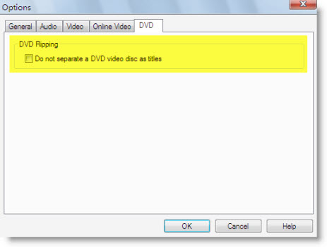 Click the "Options" button on the main interface. In the pop-up dialog, navigate to "DVD" and tick "Do not separate a DVD video disc as titles". You will get a whole DVD movie rather than separate files.