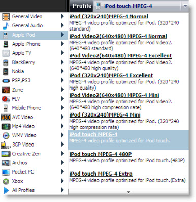 2. Extend the "Profile" category to select an output format. For example, if you want to watch DVD on your iPod Touch, you can choose "iPod touch MPEG-4" as the output format.