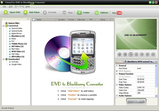 Now you can click the "Start Encode" button to starting ripping DVD movies, converting video files and converting YouTube videos for your BlackBerry Tour.